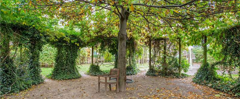 Dejlig og naturskøn gård, med græsplæne, bænke, gril, cykelskur og legeplads.